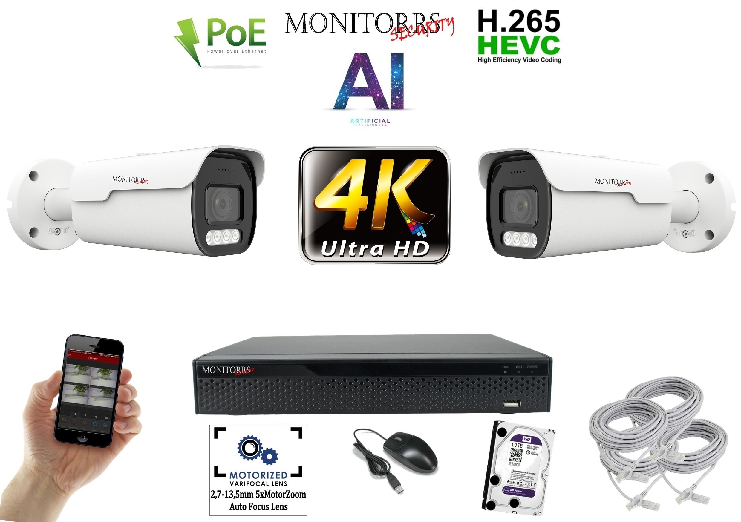 - Monitorrs Security 4k park AI IP 2 kamerový set 8 Mpix WTube (6380K2)