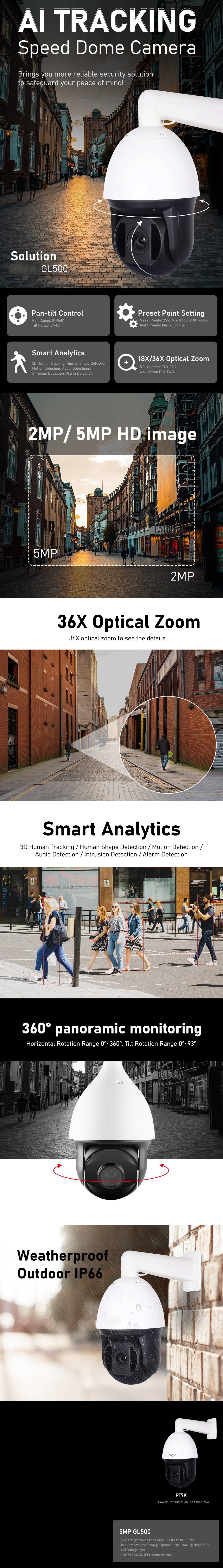 Hlavné vlastnosti MS36GL500 5MP PTZ kamery (AI PTZ séria):